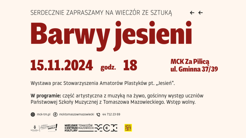 Podczas wydarzenia będzie można obejrzeć prace artystów ze Stowarzyszenia Amatorów Plastyków w Tomaszowie Mazowieckim, które pokazane zostaną na wystawie pn. „Jesień”. To kilkadziesiąt obrazów wykonanych głównie w technikach olej i akryl.